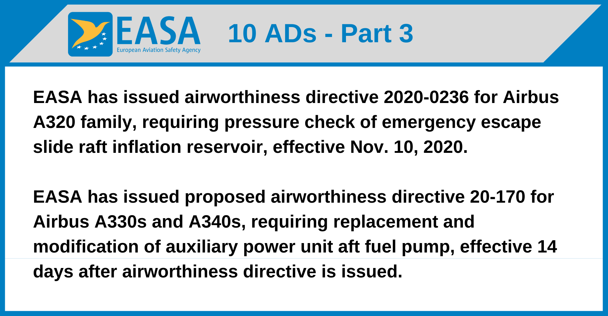 EASA has issued airworthiness directive 2020-0236 for Airbus A320 family, requiring pressure check of emergency escape slide raft inflation reservoir, effective Nov. 10, 2020.