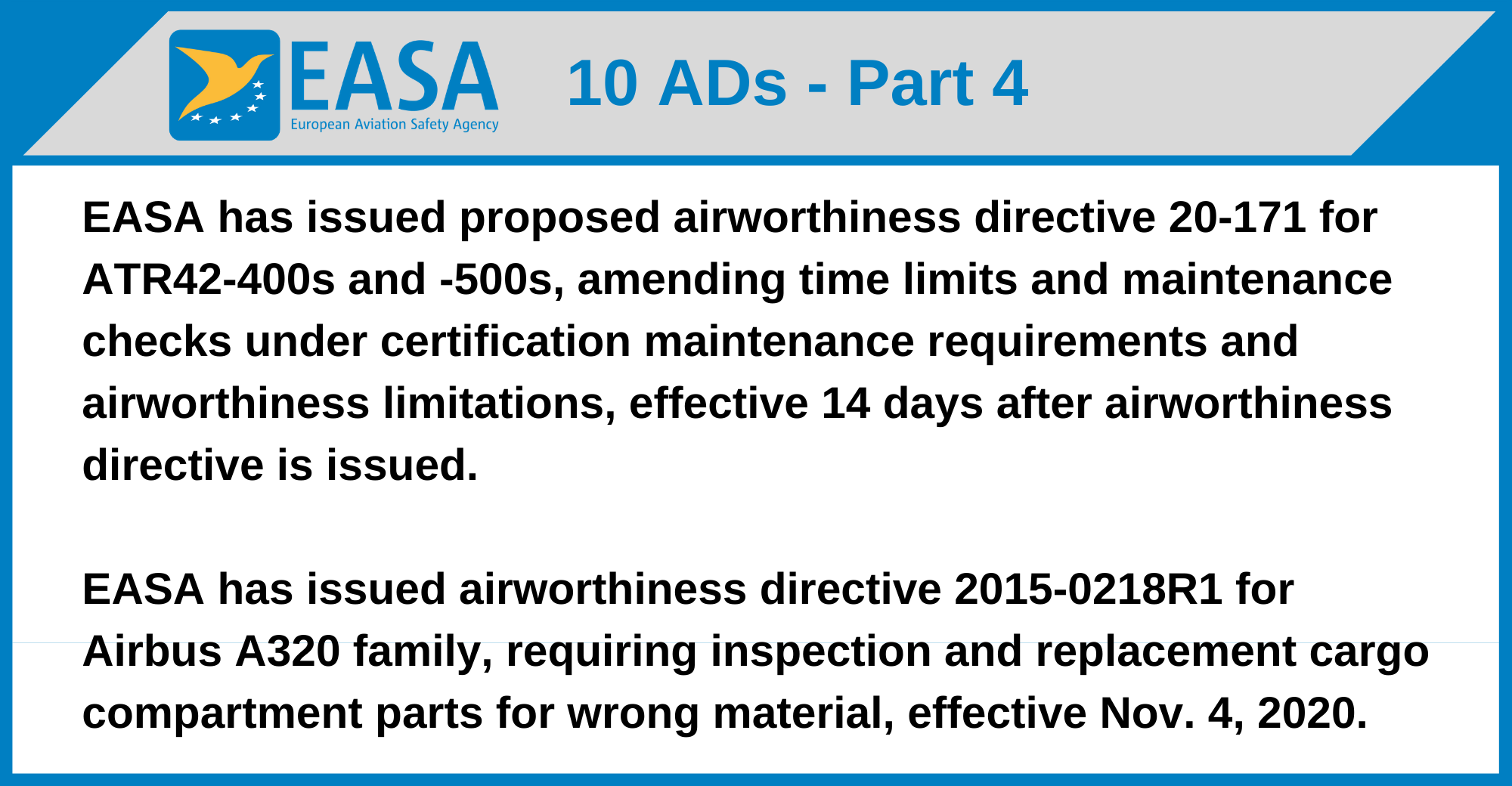 EASA has issued proposed airworthiness directive 20-171 for ATR42-400s and -500s, amending time limits and maintenance checks under certification maintenance requirements and airworthiness limitations, effective 14 days after airworthiness directive is issued.