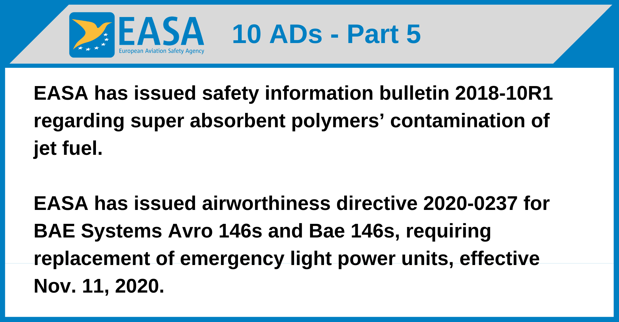 EASA has issued airworthiness directive 2020-0237 for BAE Systems Avro 146s and Bae 146s, requiring replacement of emergency light power units, effective Nov. 11, 2020.