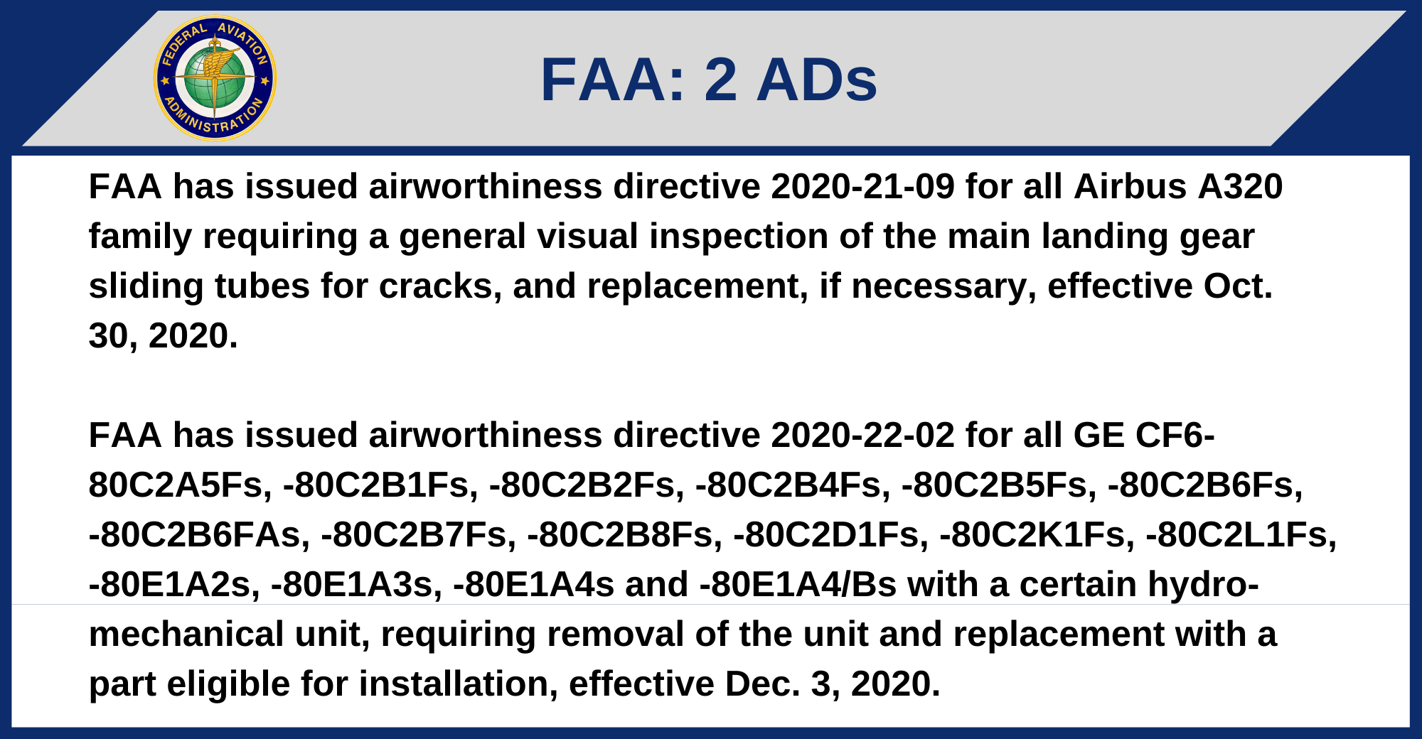 FAA has issued airworthiness directive 2020-21-09 for all Airbus A320 family requiring a general visual inspection of the main landing gear sliding tubes for cracks, and replacement, if necessary, effective Oct. 30, 2020.
