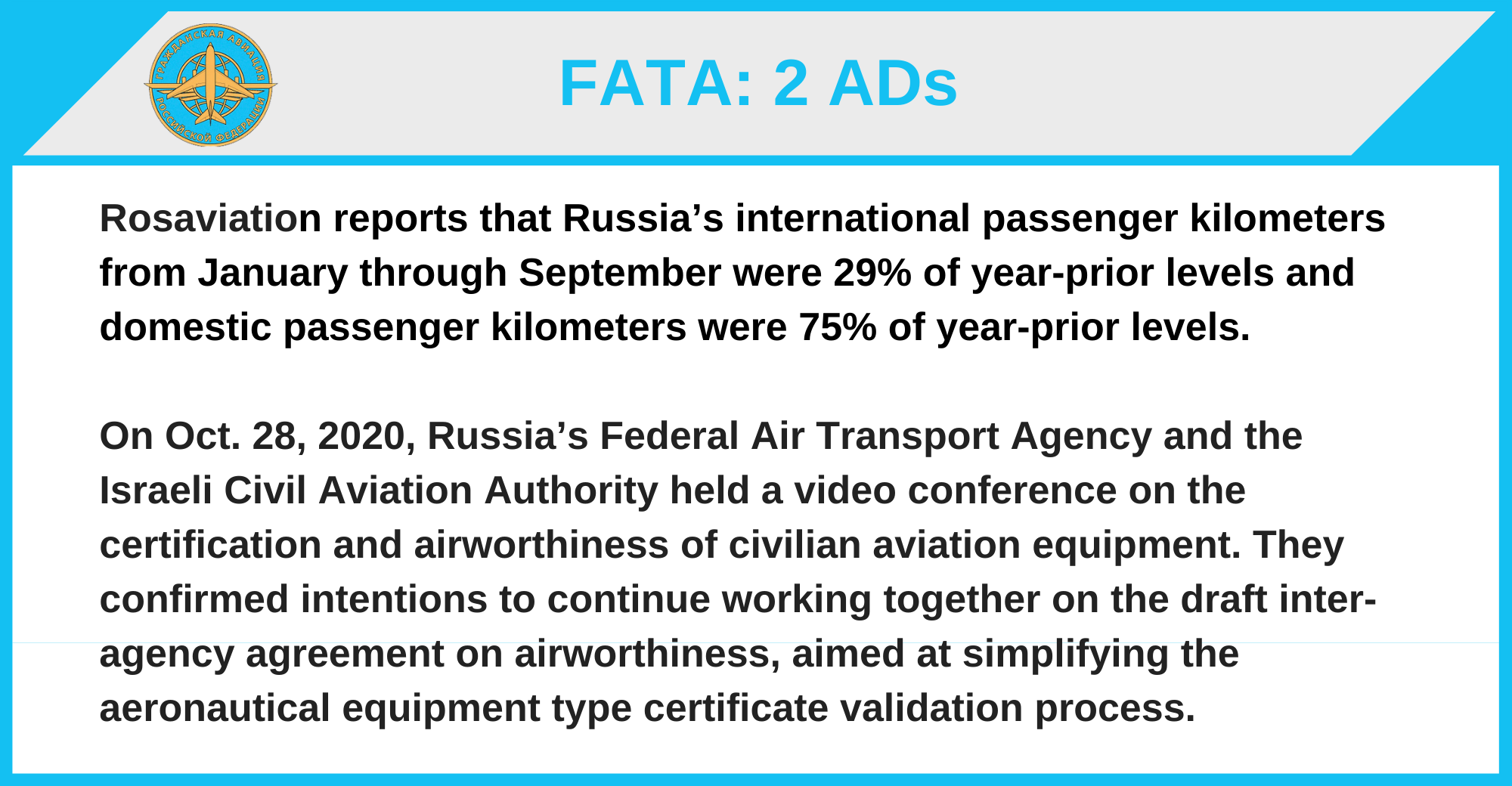 Rosaviation reports that Russia’s international passenger kilometers from January through September were 29% of year-prior levels and domestic passenger kilometers were 75% of year-prior levels.