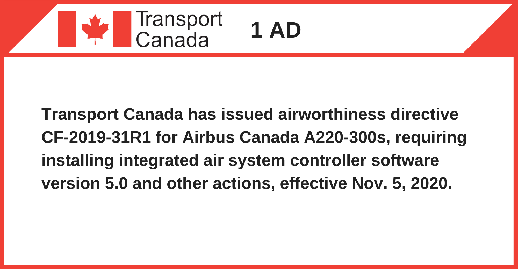 Transport Canada has issued airworthiness directive CF-2019-31R1 for Airbus Canada A220-300s, requiring installing integrated air system controller software version 5.0 and other actions, effective Nov. 5, 2020.