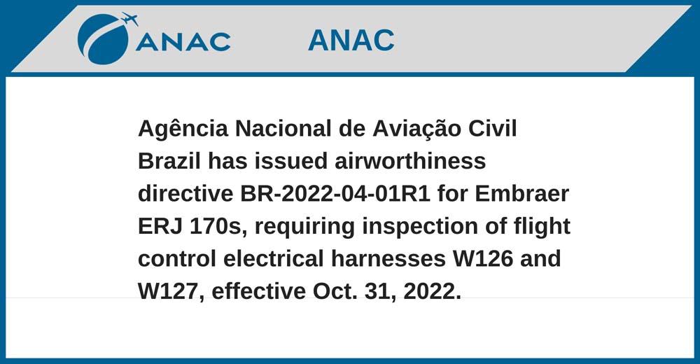 Agência Nacional de Aviação Civil Brazil has issued airworthiness directive BR-2022-04-01R1 for Embraer ERJ 170s, requiring inspection of flight control electrical harnesses W126 and W127, effective Oct. 31, 2022.