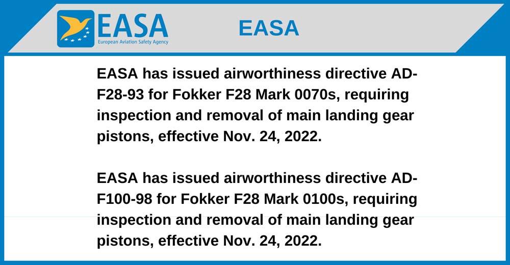 EASA has issued airworthiness directive AD-F100-98 for Fokker F28 Mark 0100s, requiring inspection and removal of main landing gear pistons, effective Nov. 24, 2022.