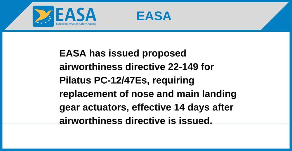 EASA has issued proposed airworthiness directive 22-149 for Pilatus PC-12/47Es, requiring replacement of nose and main landing gear actuators, effective 14 days after airworthiness directive is issued.