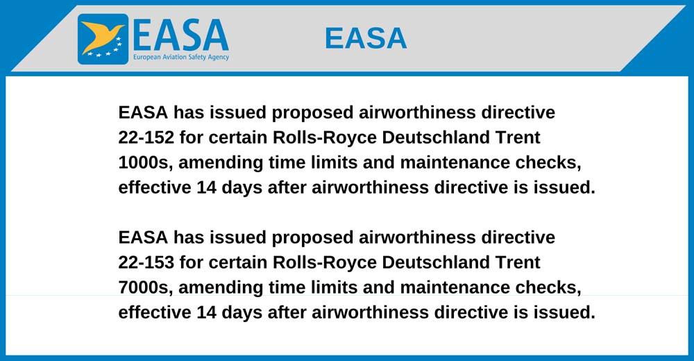 EASA has issued proposed airworthiness directive 22-153 for certain Rolls-Royce Deutschland Trent 7000s, amending time limits and maintenance checks, effective 14 days after airworthiness directive is issued.