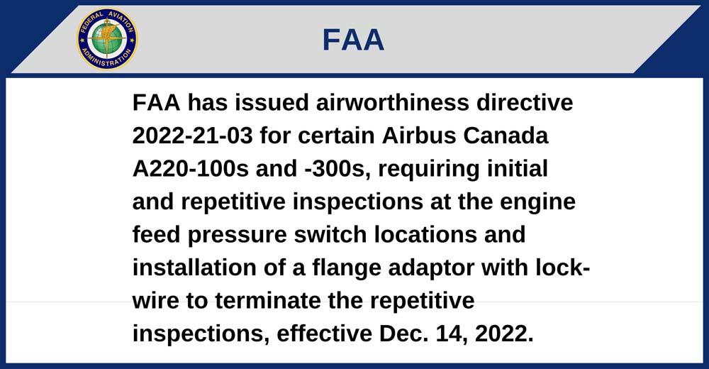 FAA has issued airworthiness directive 2022-21-03 for certain Airbus Canada A220-100s and -300s, requiring initial and repetitive inspections at the engine feed pressure switch locations and installation of a flange adaptor with lock-wire to terminate the repetitive inspections, effective Dec. 14, 2022.