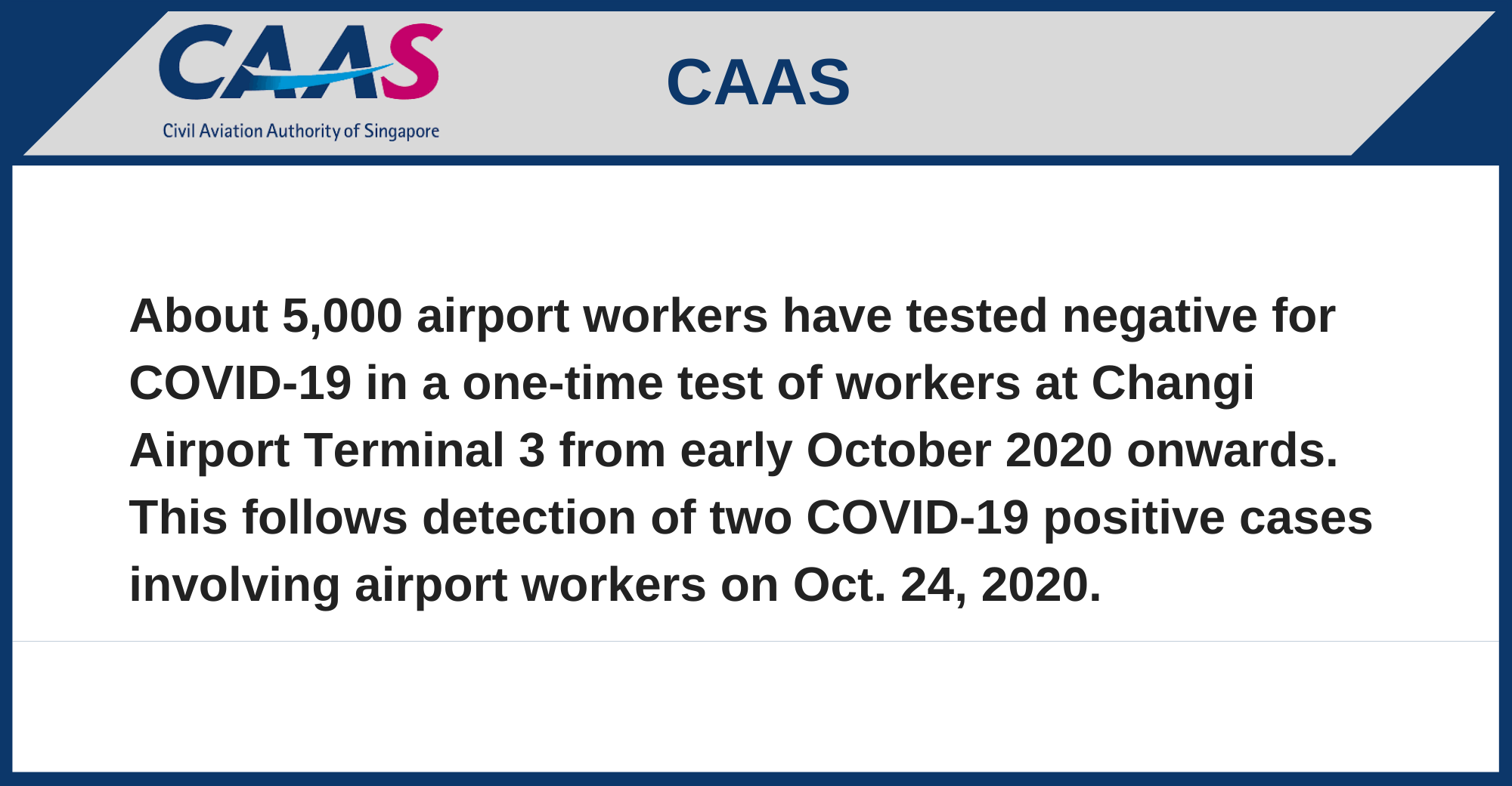 About 5,000 airport workers have tested negative for COVID-19 in a one-time test of workers at Changi Airport Terminal 3 from early October 2020 onwards. This follows detection of two COVID-19 positive cases involving airport workers on Oct. 24, 2020.