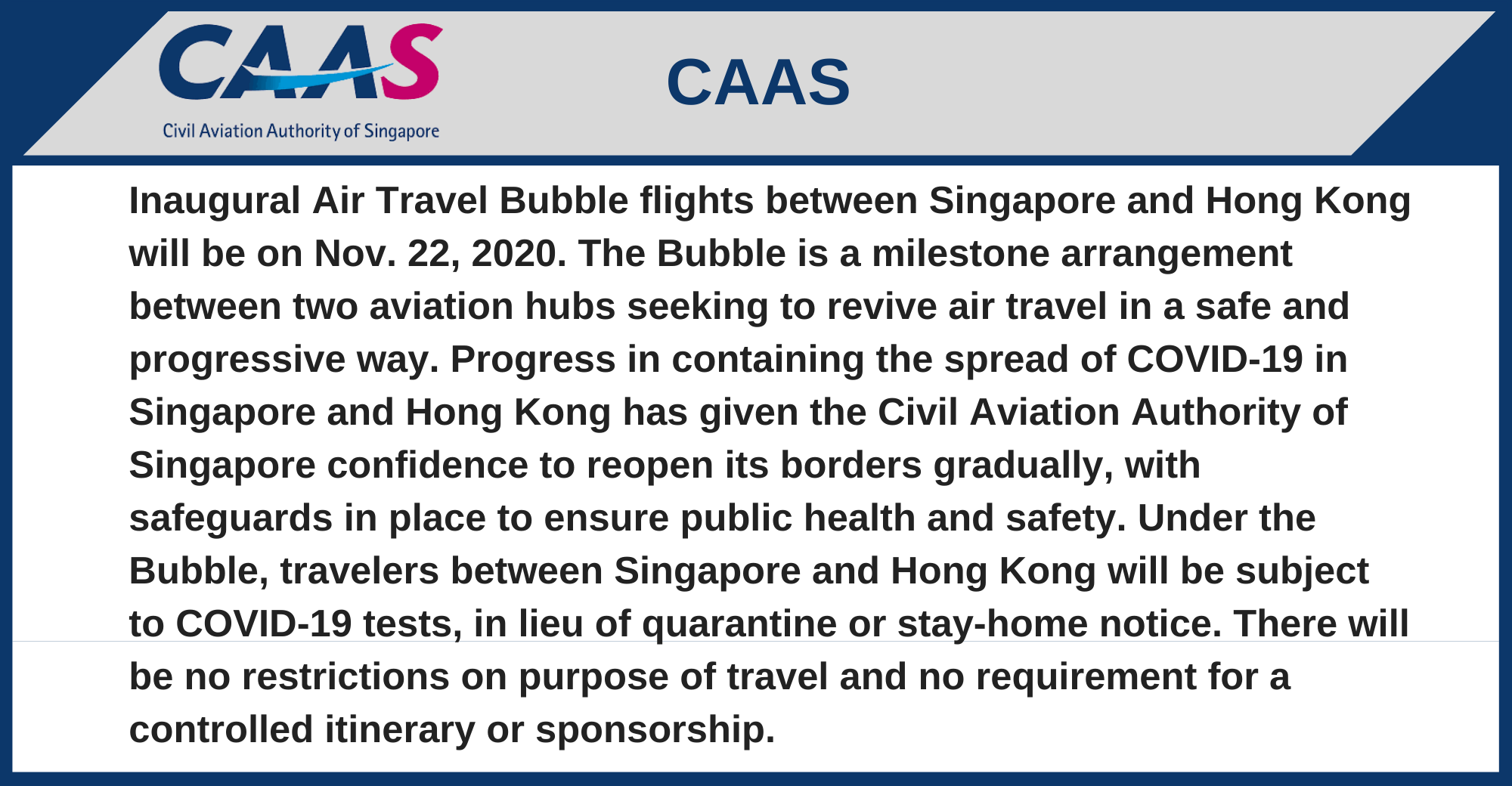 Inaugural Air Travel Bubble flights between Singapore and Hong Kong will be on Nov. 22, 2020. The Bubble is a milestone arrangement between two aviation hubs seeking to revive air travel in a safe and progressive way. Progress in containing the spread of COVID-19 in Singapore and Hong Kong has given the Civil Aviation Authority of Singapore confidence to reopen its borders gradually, with safeguards in place to ensure public health and safety. Under the Bubble, travelers between Singapore and Hong Kong will be subject to COVID-19 tests, in lieu of quarantine or stay-home notice. There will be no restrictions on purpose of travel and no requirement for a controlled itinerary or sponsorship.