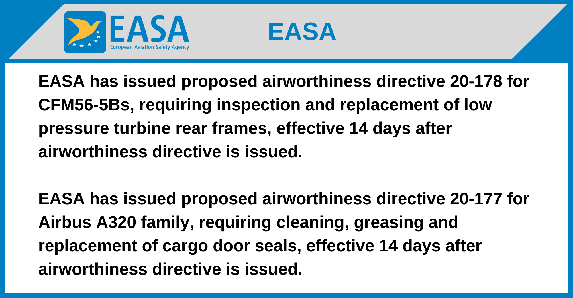 EASA has issued proposed airworthiness directive 20-178 for CFM56-5Bs, requiring inspection and replacement of low pressure turbine rear frames, effective 14 days after airworthiness directive is issued.