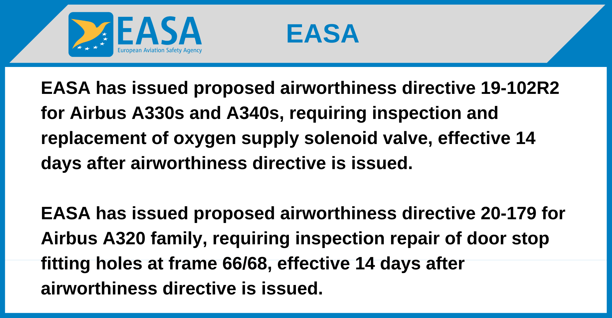 EASA has issued proposed airworthiness directive 19-102R2 for Airbus A330s and A340s, requiring inspection and replacement of oxygen supply solenoid valve, effective 14 days after airworthiness directive is issued.