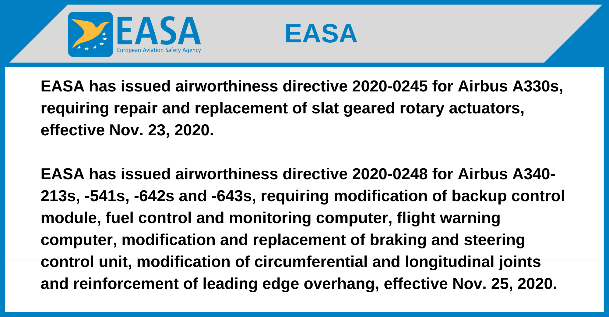 EASA has issued airworthiness directive 2020-0245 for Airbus A330s, requiring repair and replacement of slat geared rotary actuators, effective Nov. 23, 2020.