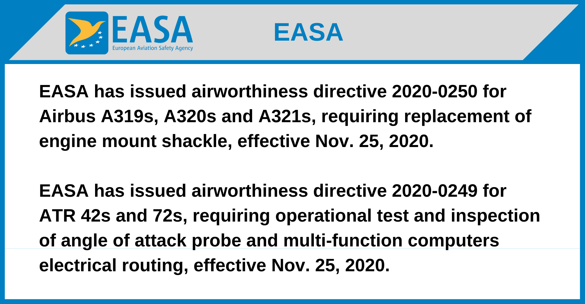 EASA has issued airworthiness directive 2020-0249 for ATR 42s and 72s, requiring operational test and inspection of angle of attack probe and multi-function computers electrical routing, effective Nov. 25, 2020.