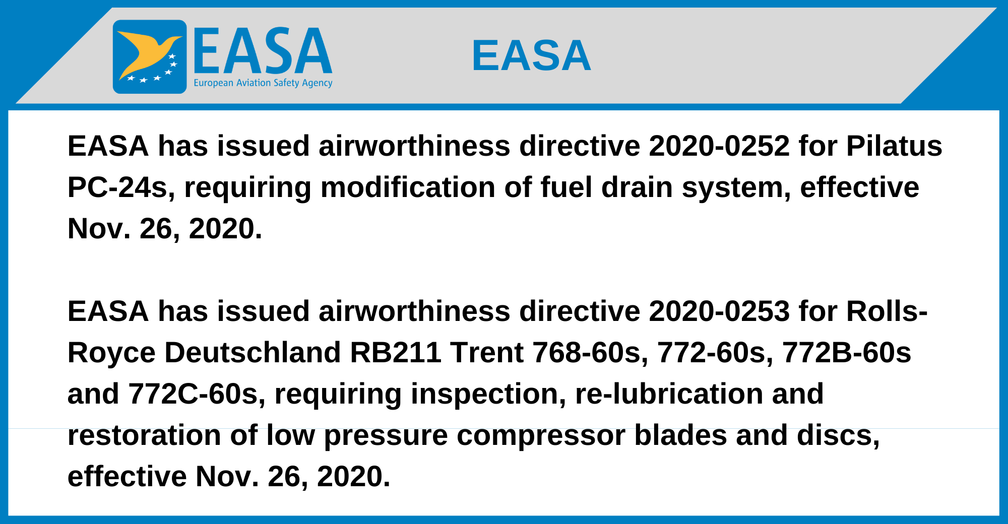 EASA has issued airworthiness directive 2020-0252 for Pilatus PC-24s, requiring modification of fuel drain system, effective Nov. 26, 2020.