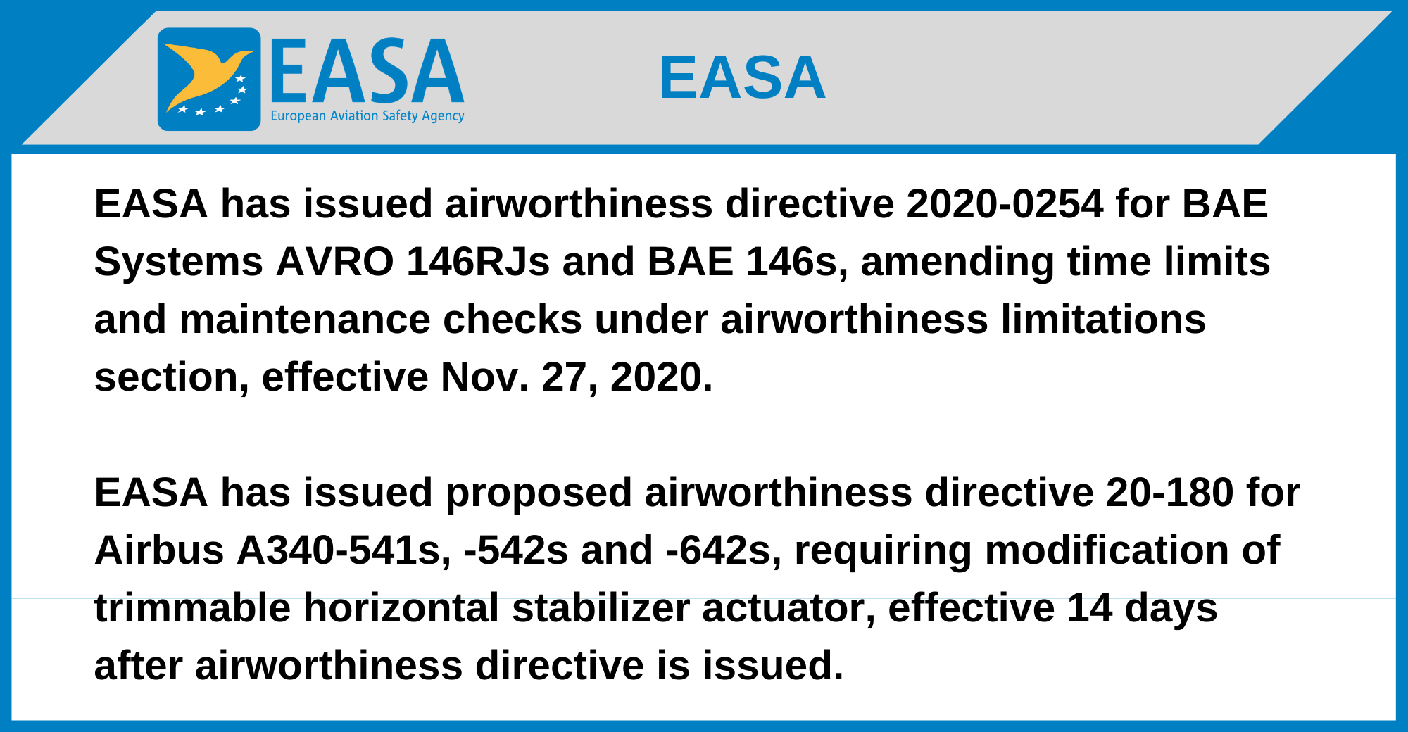 EASA has issued airworthiness directive 2020-0254 for BAE Systems AVRO 146RJs and BAE 146s, amending time limits and maintenance checks under airworthiness limitations section, effective Nov. 27, 2020.