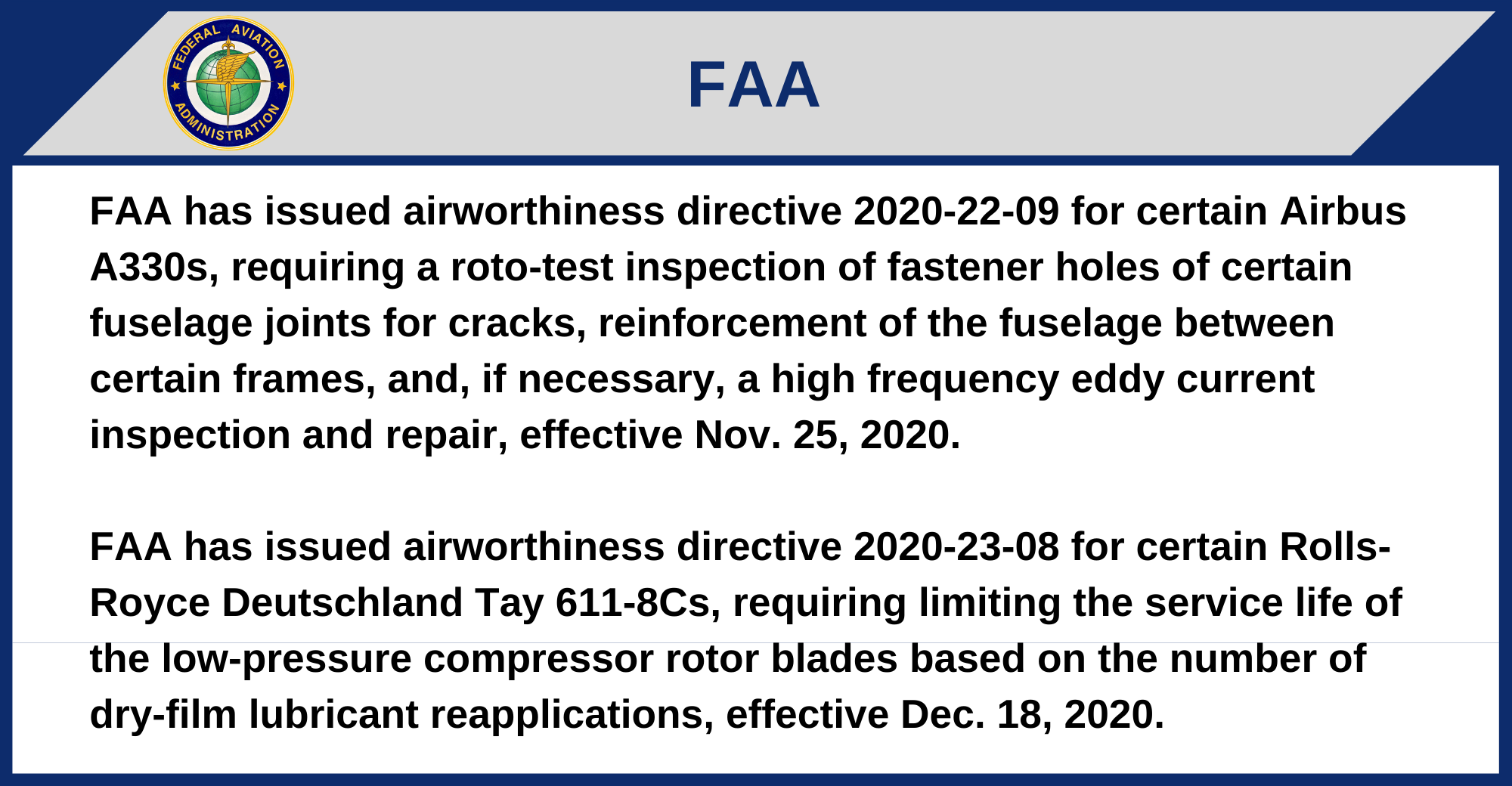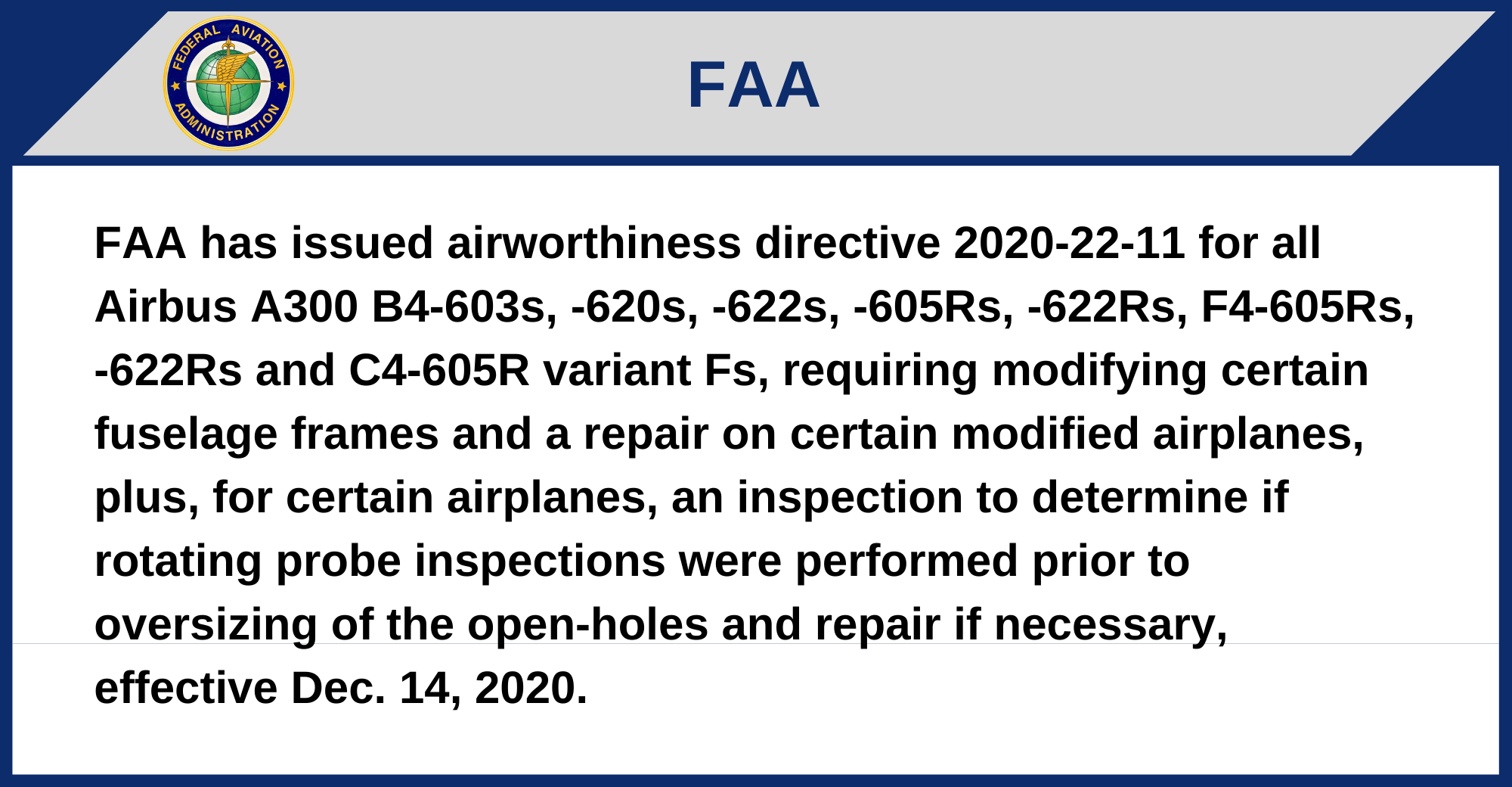FAA has issued airworthiness directive 2020-22-11 for all Airbus A300 B4-603s, -620s, -622s, -605Rs, -622Rs, F4-605Rs, -622Rs and C4-605R variant Fs, requiring modifying certain fuselage frames and a repair on certain modified airplanes, plus, for certain airplanes, an inspection to determine if rotating probe inspections were performed prior to oversizing of the open-holes and repair if necessary, effective Dec. 14, 2020.