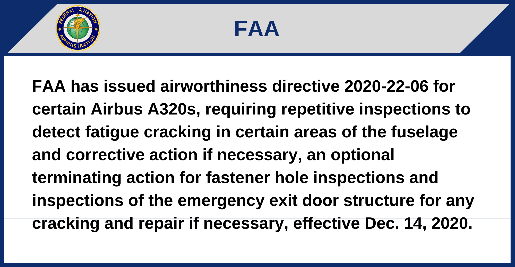 FAA has issued airworthiness directive 2020-22-06 for certain Airbus A320s, requiring repetitive inspections to detect fatigue cracking in certain areas of the fuselage and corrective action if necessary, an optional terminating action for fastener hole inspections and inspections of the emergency exit door structure for any cracking and repair if necessary, effective Dec. 14, 2020.