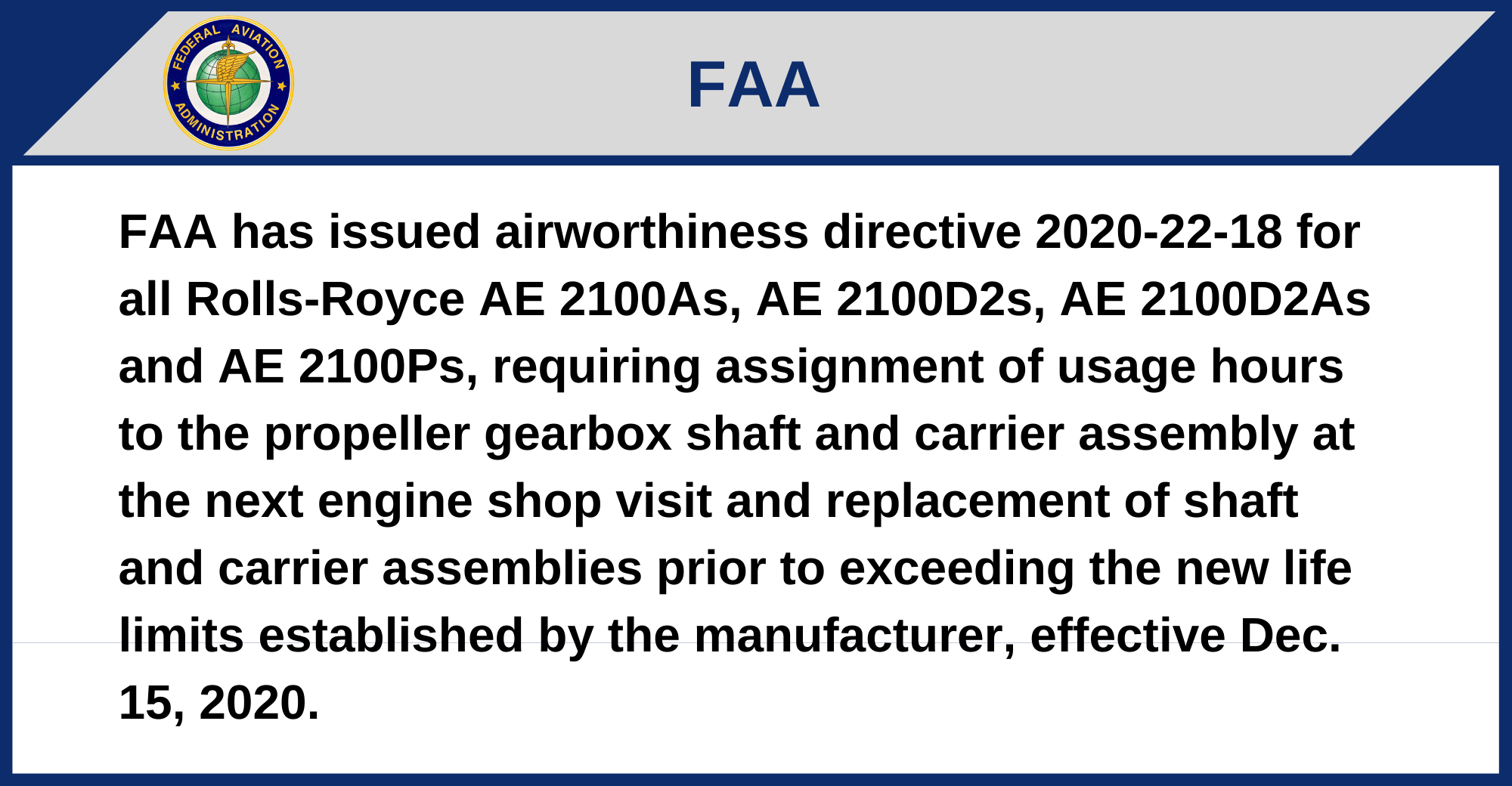 FAA has issued airworthiness directive 2020-22-18 for all Rolls-Royce AE 2100As, AE 2100D2s, AE 2100D2As and AE 2100Ps, requiring assignment of usage hours to the propeller gearbox shaft and carrier assembly at the next engine shop visit and replacement of shaft and carrier assemblies prior to exceeding the new life limits established by the manufacturer, effective Dec. 15, 2020.