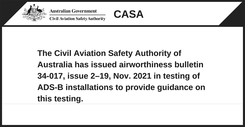 The Civil Aviation Safety Authority of Australia has issued airworthiness bulletin 34-017, issue 2–19, Nov. 2021 in testing of ADS-B installations to provide guidance on this testing.