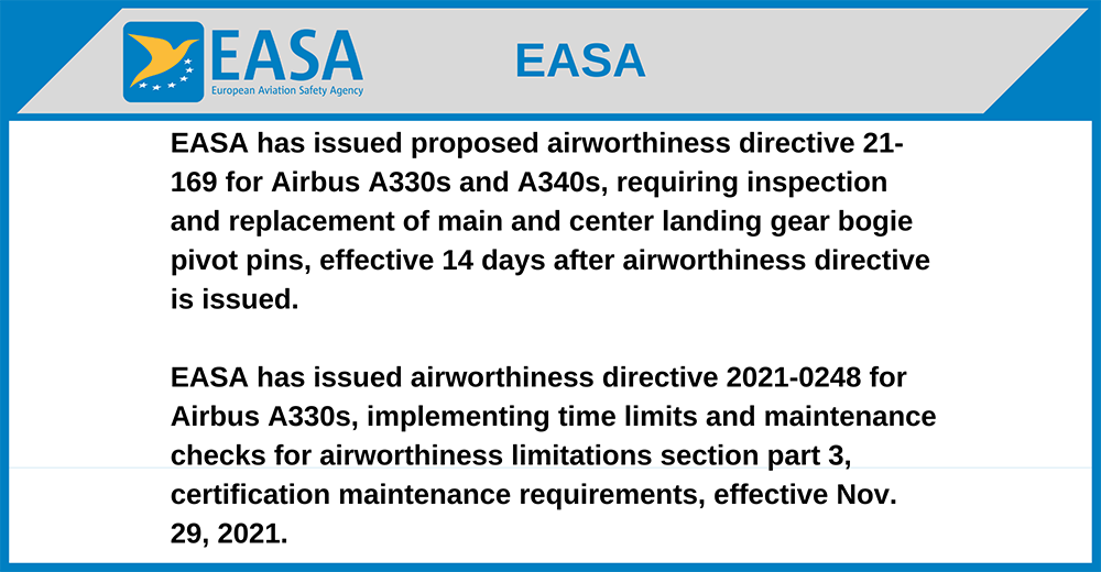 EASA has issued proposed airworthiness directive 21-169 for Airbus A330s and A340s, requiring inspection and replacement of main and center landing gear bogie pivot pins, effective 14 days after airworthiness directive is issued.
