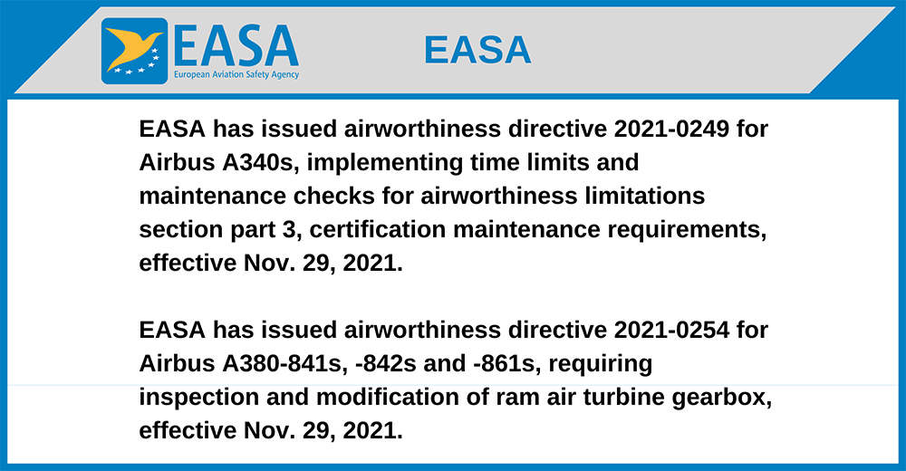 EASA has issued airworthiness directive 2021-0249 for Airbus A340s, implementing time limits and maintenance checks for airworthiness limitations section part 3, certification maintenance requirements, effective Nov. 29, 2021.