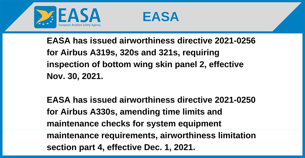 EASA has issued airworthiness directive 2021-0256 for Airbus A319s, 320s and 321s, requiring inspection of bottom wing skin panel 2, effective Nov. 30, 2021.
