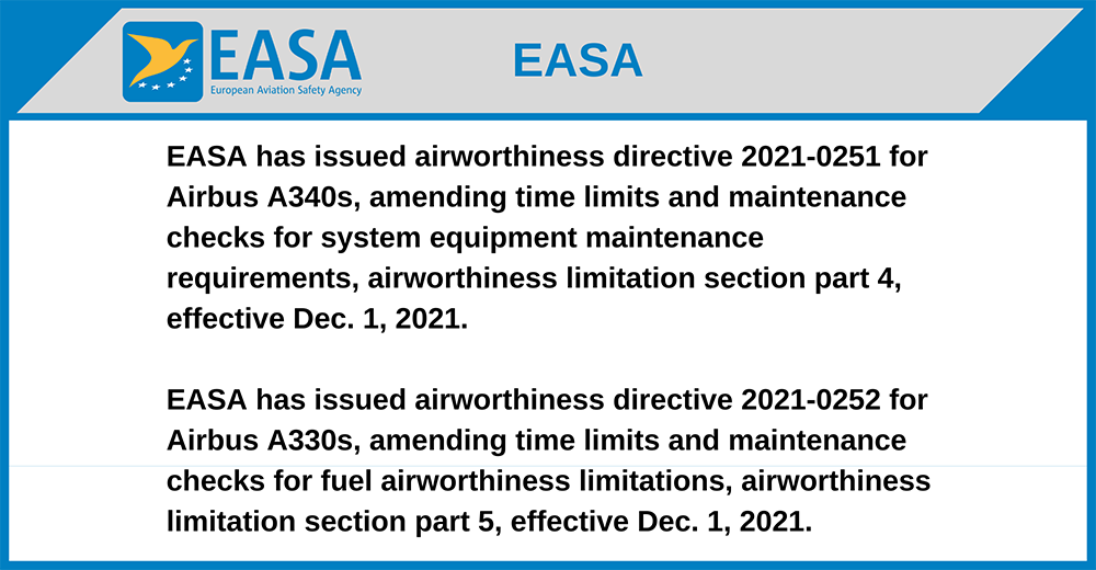 EASA has issued airworthiness directive 2021-0252 for Airbus A330s, amending time limits and maintenance checks for fuel airworthiness limitations, airworthiness limitation section part 5, effective Dec. 1, 2021.