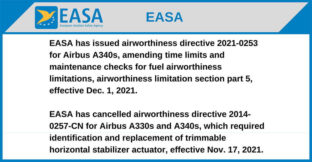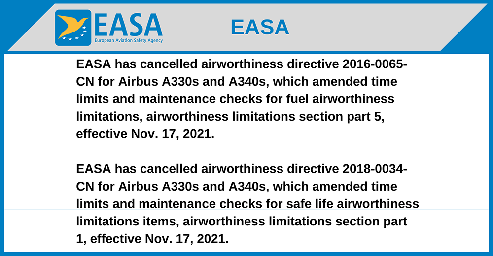 EASA has cancelled airworthiness directive 2016-0065-CN for Airbus A330s and A340s, which amended time limits and maintenance checks for fuel airworthiness limitations, airworthiness limitations section part 5, effective Nov. 17, 2021.