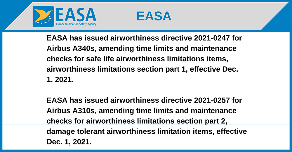 EASA has issued airworthiness directive 2021-0247 for Airbus A340s, amending time limits and maintenance checks for safe life airworthiness limitations items, airworthiness limitations section part 1, effective Dec. 1, 2021.