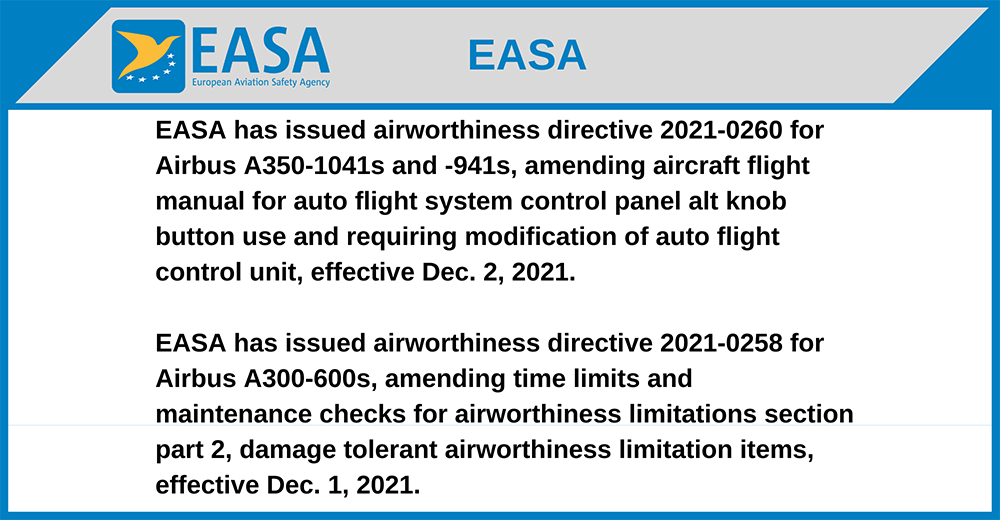 EASA has issued airworthiness directive 2021-0260 for Airbus A350-1041s and -941s, amending aircraft flight manual for auto flight system control panel alt knob button use and requiring modification of auto flight control unit, effective Dec. 2, 2021.