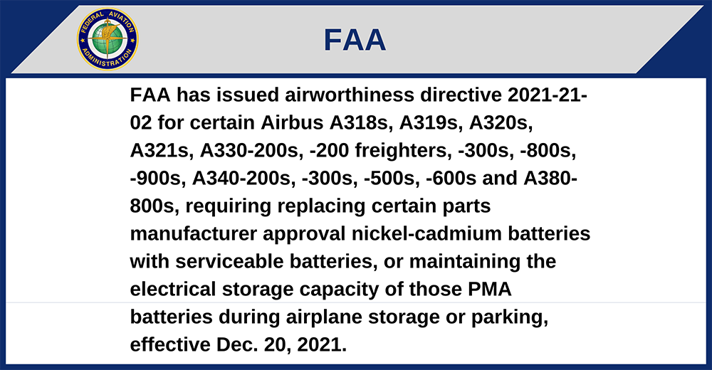 FAA has issued airworthiness directive 2021-21-02 for certain Airbus A318s, A319s, A320s, A321s, A330-200s, -200 freighters, -300s, -800s, -900s, A340-200s, -300s, -500s, -600s and A380-800s, requiring replacing certain parts manufacturer approval nickel-cadmium batteries with serviceable batteries, or maintaining the electrical storage capacity of those PMA batteries during airplane storage or parking, effective Dec. 20, 2021.