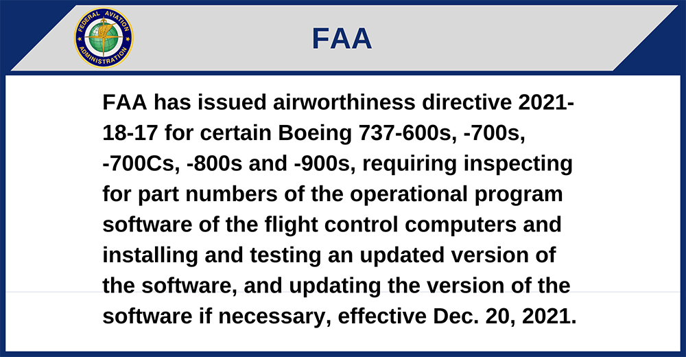 FAA has issued airworthiness directive 2021-18-17 for certain Boeing 737-600s, -700s, -700Cs, -800s and -900s, requiring inspecting for part numbers of the operational program software of the flight control computers and installing and testing an updated version of the software, and updating the version of the software if necessary, effective Dec. 20, 2021.
