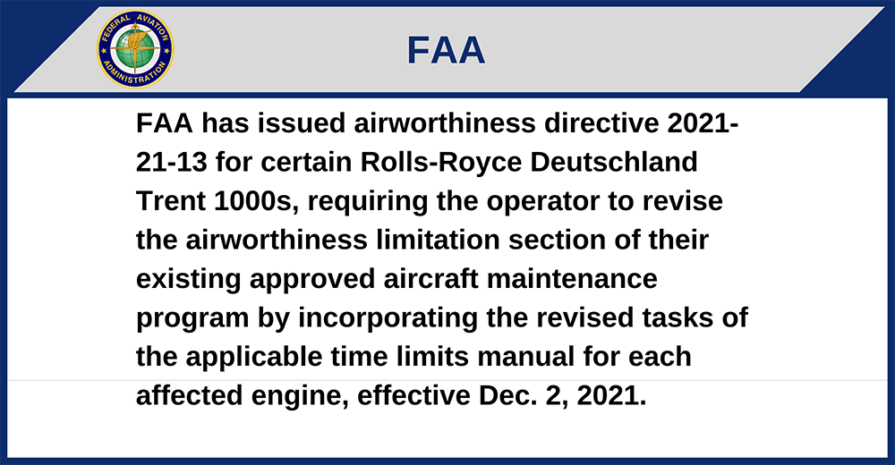 FAA has issued airworthiness directive 2021-21-13 for certain Rolls-Royce Deutschland Trent 1000s, requiring the operator to revise the airworthiness limitation section of their existing approved aircraft maintenance program by incorporating the revised tasks of the applicable time limits manual for each affected engine, effective Dec. 2, 2021.