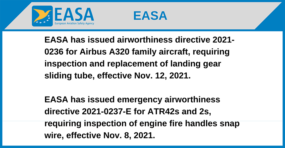 EASA has issued airworthiness directive 2021-0236 for Airbus A320 family aircraft, requiring inspection and replacement of landing gear sliding tube, effective Nov. 12, 2021.
