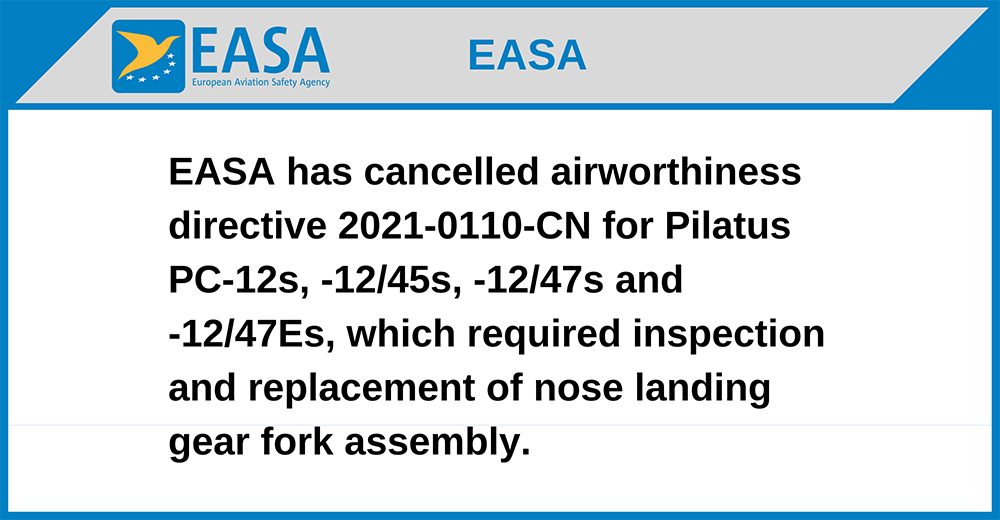 EASA has cancelled airworthiness directive 2021-0110-CN for Pilatus PC-12s, -12/45s, -12/47s and -12/47Es, which required inspection and replacement of nose landing gear fork assembly.