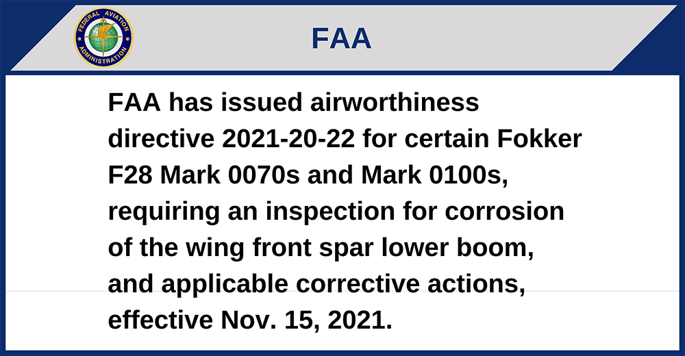 FAA has issued airworthiness directive 2021-20-22 for certain Fokker F28 Mark 0070s and Mark 0100s, requiring an inspection for corrosion of the wing front spar lower boom, and applicable corrective actions, effective Nov. 15, 2021.