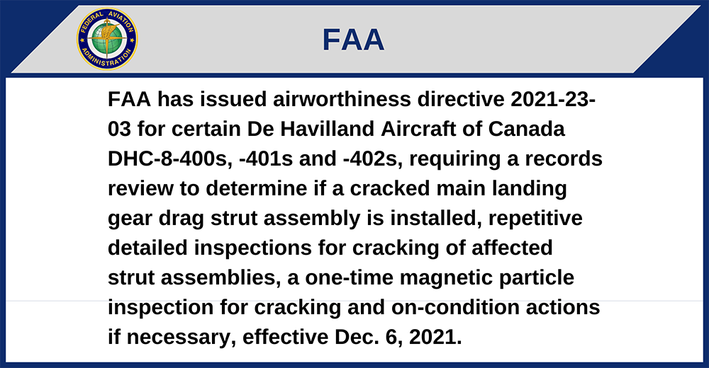 FAA has issued airworthiness directive 2021-23-03 for certain De Havilland Aircraft of Canada DHC-8-400s, -401s and -402s, requiring a records review to determine if a cracked main landing gear drag strut assembly is installed, repetitive detailed inspections for cracking of affected strut assemblies, a one-time magnetic particle inspection for cracking and on-condition actions if necessary, effective Dec. 6, 2021.
