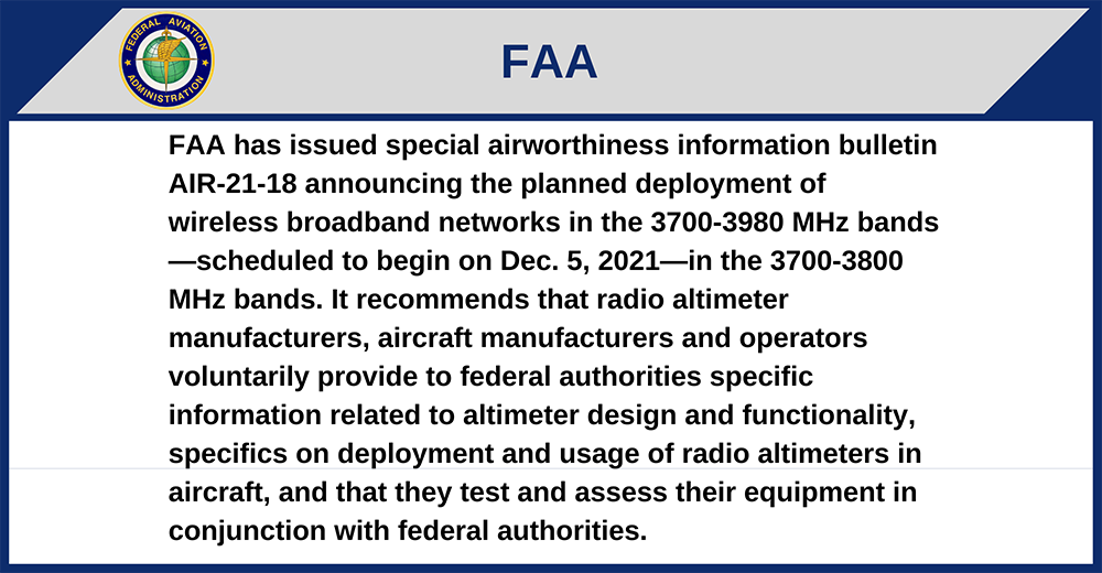 FAA has issued special airworthiness information bulletin AIR-21-18 announcing the planned deployment of wireless broadband networks in the 3700-3980 MHz bands—scheduled to begin on Dec. 5, 2021—in the 3700-3800 MHz bands. It recommends that radio altimeter manufacturers, aircraft manufacturers and operators voluntarily provide to federal authorities specific information related to altimeter design and functionality, specifics on deployment and usage of radio altimeters in aircraft, and that they test and assess their equipment in conjunction with federal authorities.