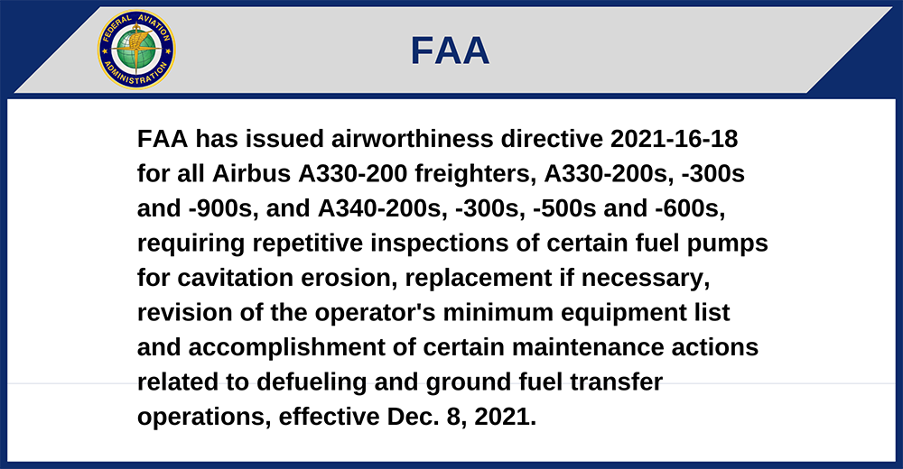 FAA has issued airworthiness directive 2021-16-18 for all Airbus A330-200 freighters, A330-200s, -300s and -900s, and A340-200s, -300s, -500s and -600s, requiring repetitive inspections of certain fuel pumps for cavitation erosion, replacement if necessary, revision of the operator's minimum equipment list and accomplishment of certain maintenance actions related to defueling and ground fuel transfer operations, effective Dec. 8, 2021.
