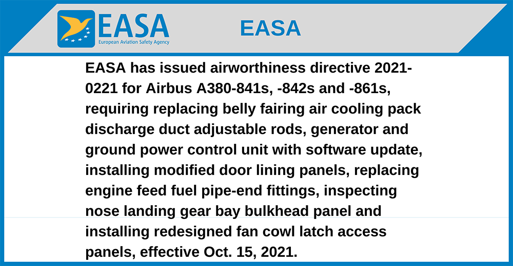 EASA has issued airworthiness directive 2021-0221 for Airbus A380-841s, -842s and -861s, requiring replacing belly fairing air cooling pack discharge duct adjustable rods, generator and ground power control unit with software update, installing modified door lining panels, replacing engine feed fuel pipe-end fittings, inspecting nose landing gear bay bulkhead panel and installing redesigned fan cowl latch access panels, effective Oct. 15, 2021.