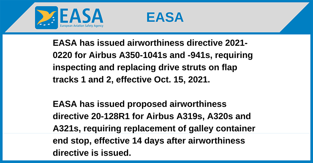 EASA has issued airworthiness directive 2021-0220 for Airbus A350-1041s and -941s, requiring inspecting and replacing drive struts on flap tracks 1 and 2, effective Oct. 15, 2021.