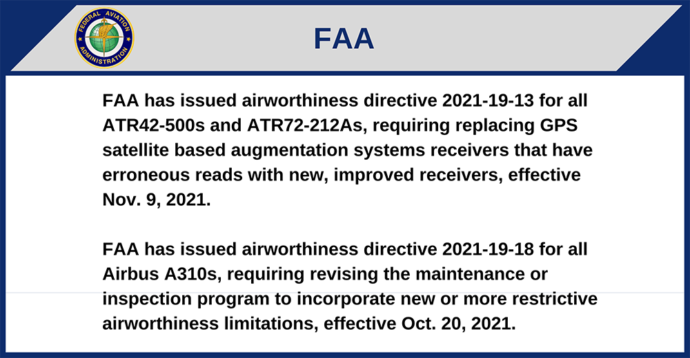 FAA has issued airworthiness directive 2021-19-13 for all ATR42-500s and ATR72-212As, requiring replacing GPS satellite based augmentation systems receivers that have erroneous reads with new, improved receivers, effective Nov. 9, 2021.