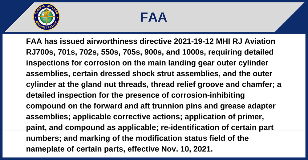 FAA has issued airworthiness directive 2021-19-12 MHI RJ Aviation RJ700s, 701s, 702s, 550s, 705s, 900s, and 1000s, requiring detailed inspections for corrosion on the main landing gear outer cylinder assemblies, certain dressed shock strut assemblies, and the outer cylinder at the gland nut threads, thread relief groove and chamfer; a detailed inspection for the presence of corrosion-inhibiting compound on the forward and aft trunnion pins and grease adapter assemblies; applicable corrective actions; application of primer, paint, and compound as applicable; re-identification of certain part numbers; and marking of the modification status field of the nameplate of certain parts, effective Nov. 10, 2021.