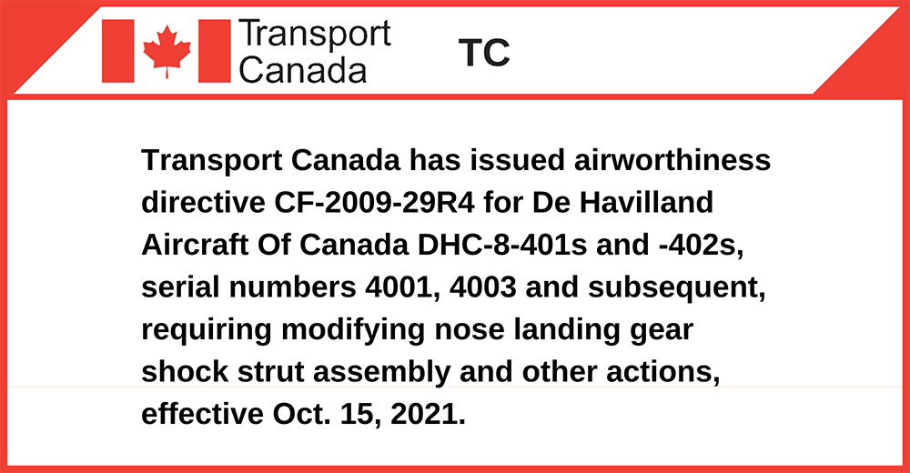 Transport Canada has issued airworthiness directive CF-2009-29R4 for De Havilland Aircraft Of Canada DHC-8-401s and -402s, serial numbers 4001, 4003 and subsequent, requiring modifying nose landing gear shock strut assembly and other actions, effective Oct. 15, 2021.