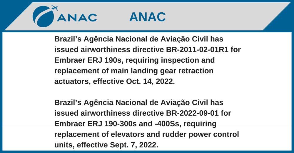 Brazil’s Agência Nacional de Aviação Civil has issued airworthiness directive BR-2011-02-01R1 for Embraer ERJ 190s, requiring inspection and replacement of main landing gear retraction actuators, effective Oct. 14, 2022.