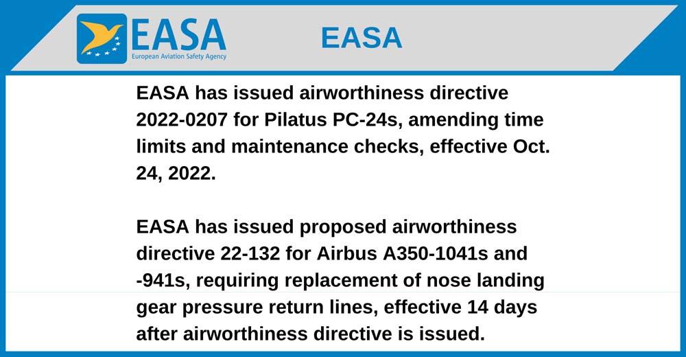 EASA has issued airworthiness directive 2022-0207 for Pilatus PC-24s, amending time limits and maintenance checks, effective Oct. 24, 2022.