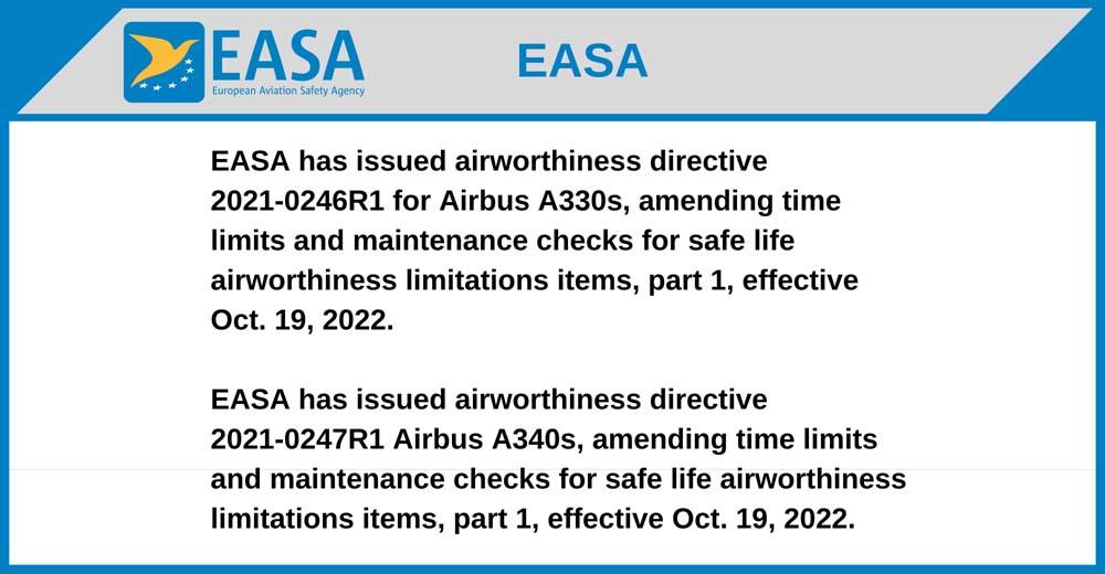 EASA has issued airworthiness directive 2021-0247R1 Airbus A340s, amending time limits and maintenance checks for safe life airworthiness limitations items, part 1, effective Oct. 19, 2022.