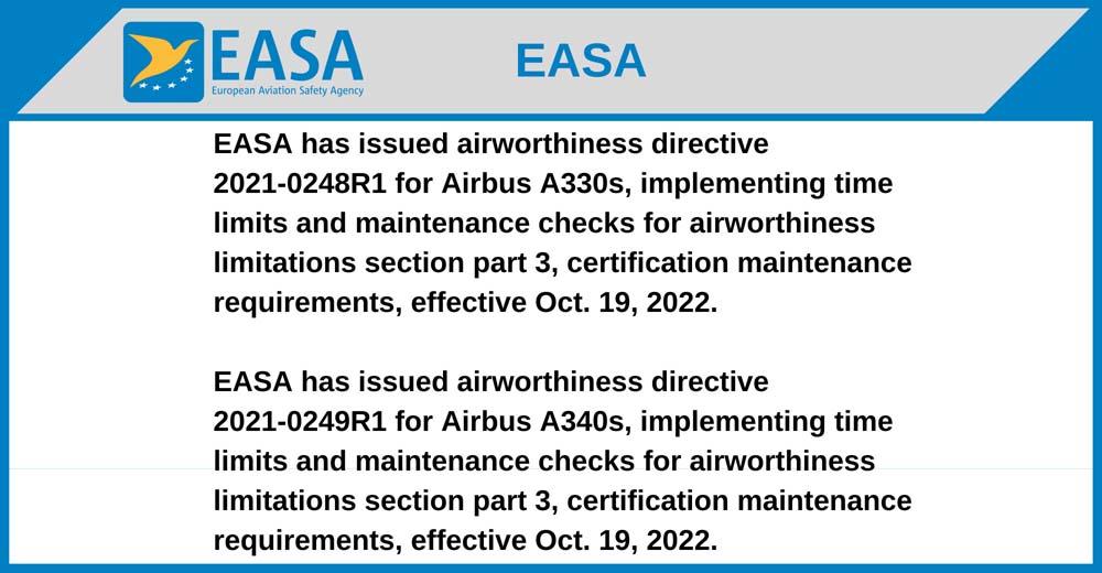 EASA has issued airworthiness directive 2021-0249R1 for Airbus A340s, implementing time limits and maintenance checks for airworthiness limitations section part 3, certification maintenance requirements, effective Oct. 19, 2022.