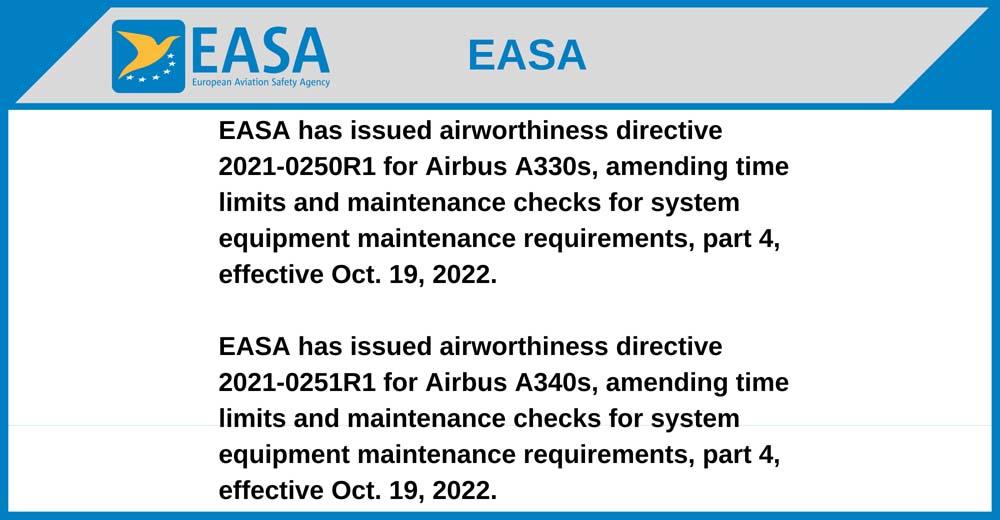 EASA has issued airworthiness directive 2021-0250R1 for Airbus A330s, amending time limits and maintenance checks for system equipment maintenance requirements, part 4, effective Oct. 19, 2022.