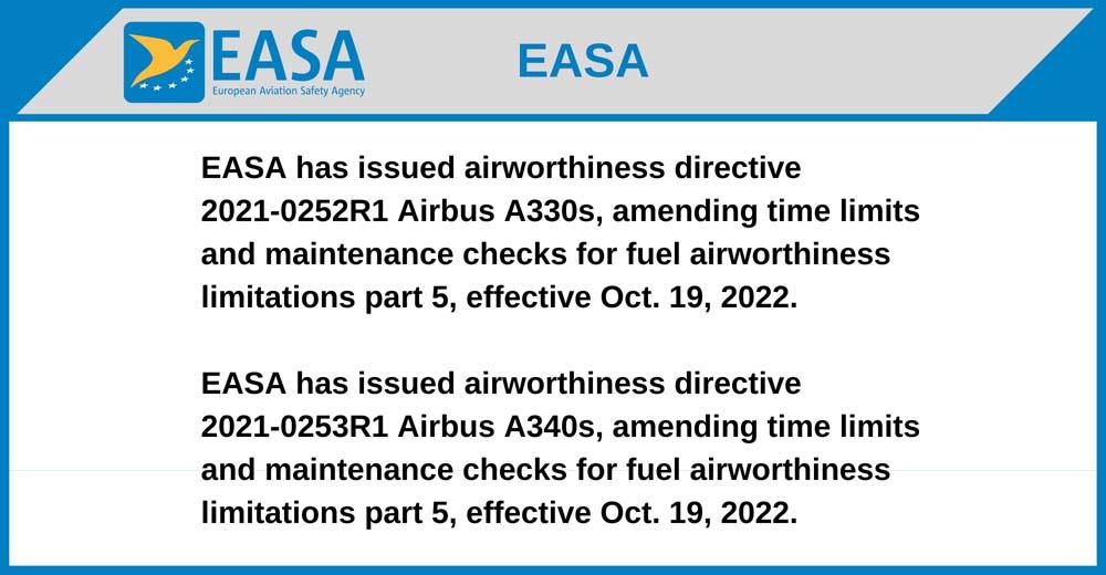EASA has issued airworthiness directive 2021-0252R1 Airbus A330s, amending time limits and maintenance checks for fuel airworthiness limitations part 5, effective Oct. 19, 2022.